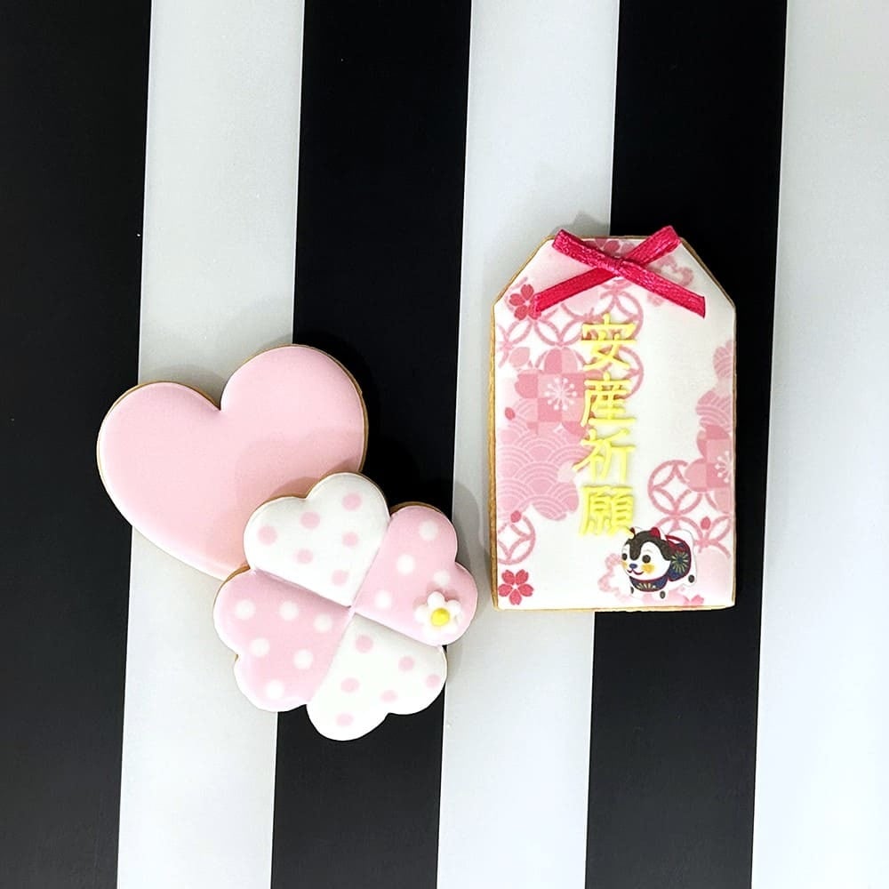 サプライズな妊娠報告に、マタニティマーククッキーとお守りクッキーが1つになったアイシングクッキーセットはいかがでしょうか?