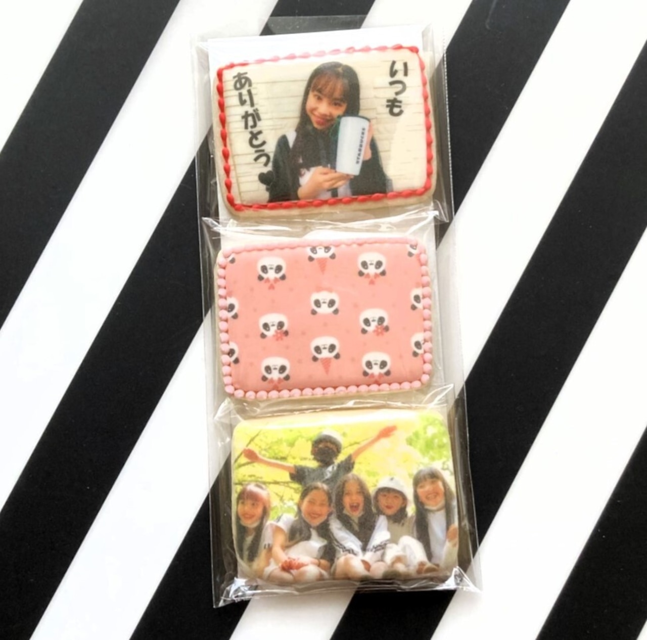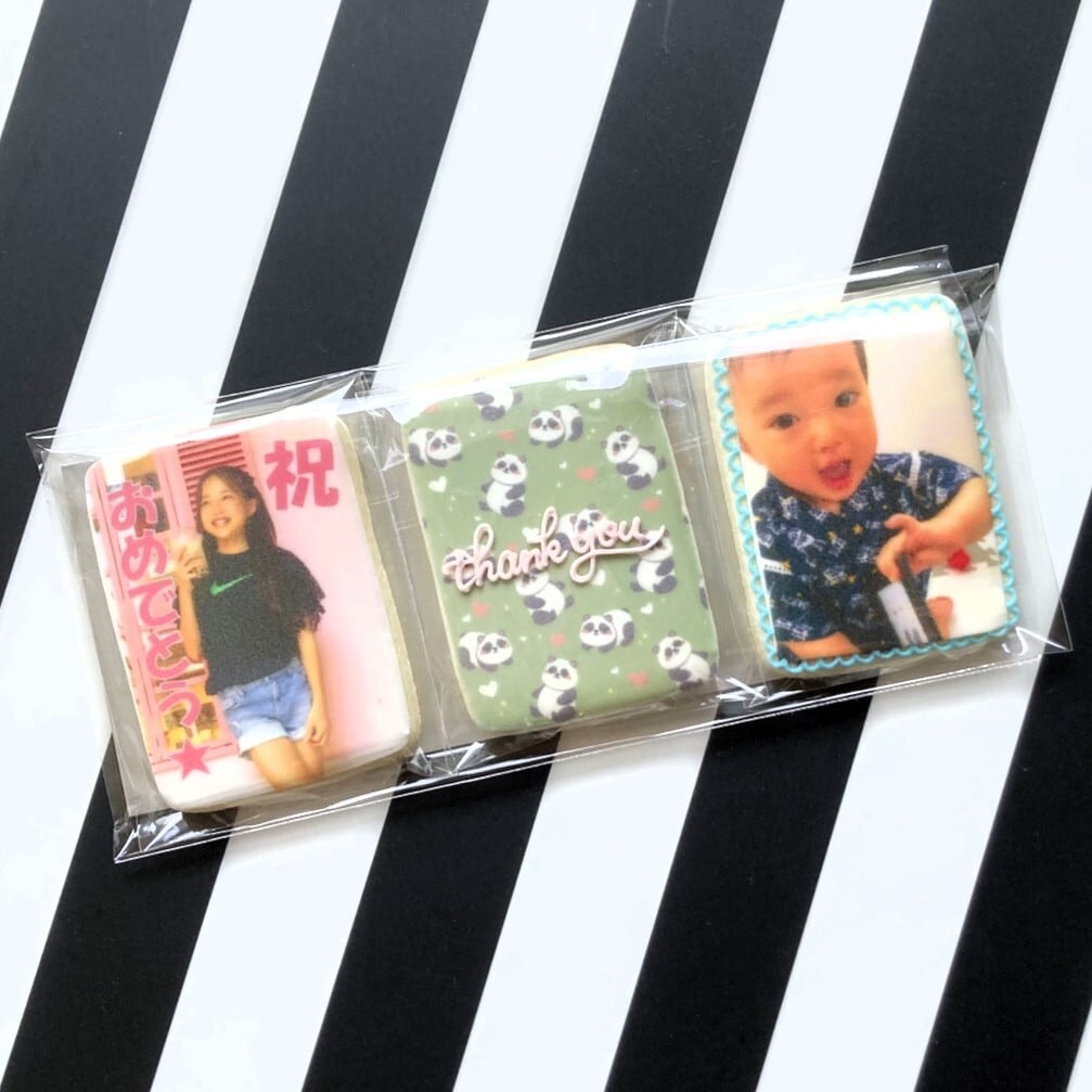 約6.5cm×約4.5cmの長方形タイプの「3枚入りプリント アイシングクッキーセット」は、ユニークなオーダーメイドのアイシングクッキーです。