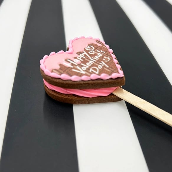 ・こだわりのデコレーション: クッキーの縁には可憐なピンクのアイシング。さらに、2枚のクッキーの間にもピンクのアイシングをサンドした贅沢仕様です。
