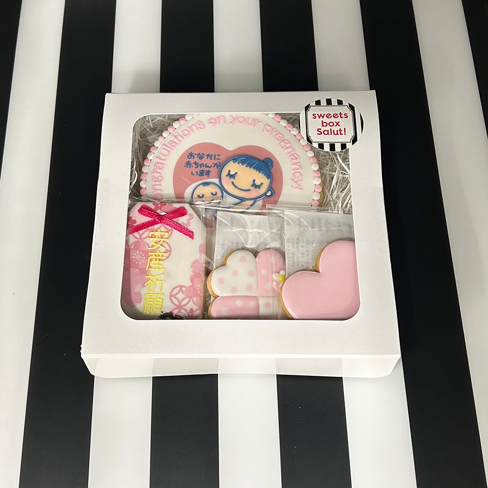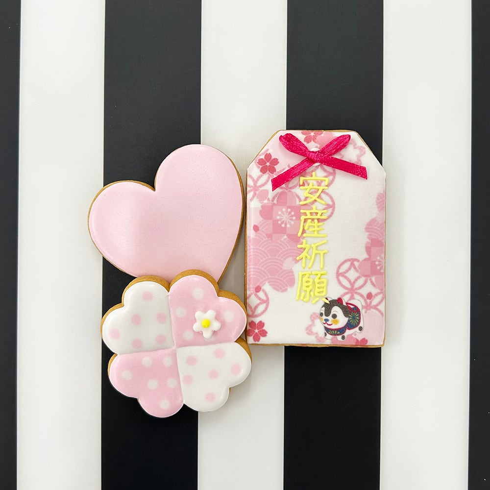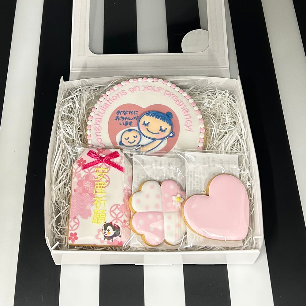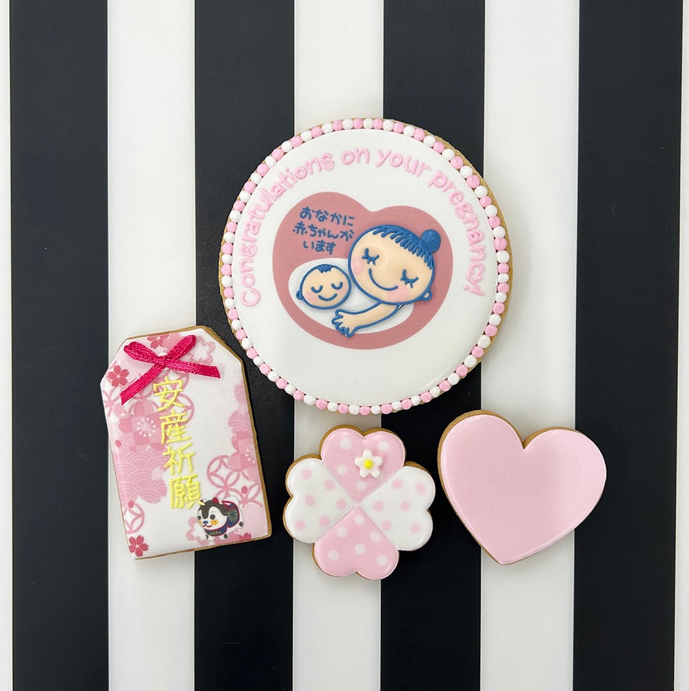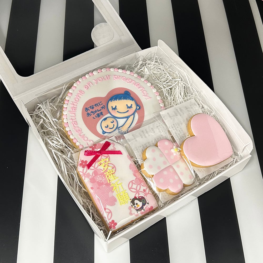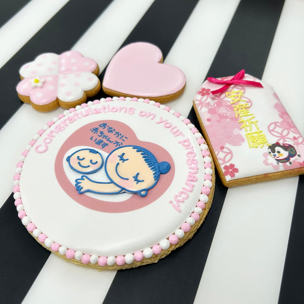 大切な人に、お腹の中に赤ちゃんがいることを伝える特別な瞬間。そんなサプライズな妊娠報告に、マタニティマーククッキーとお守りクッキーが1つになったアイシングクッキーセットはいかがでしょうか?