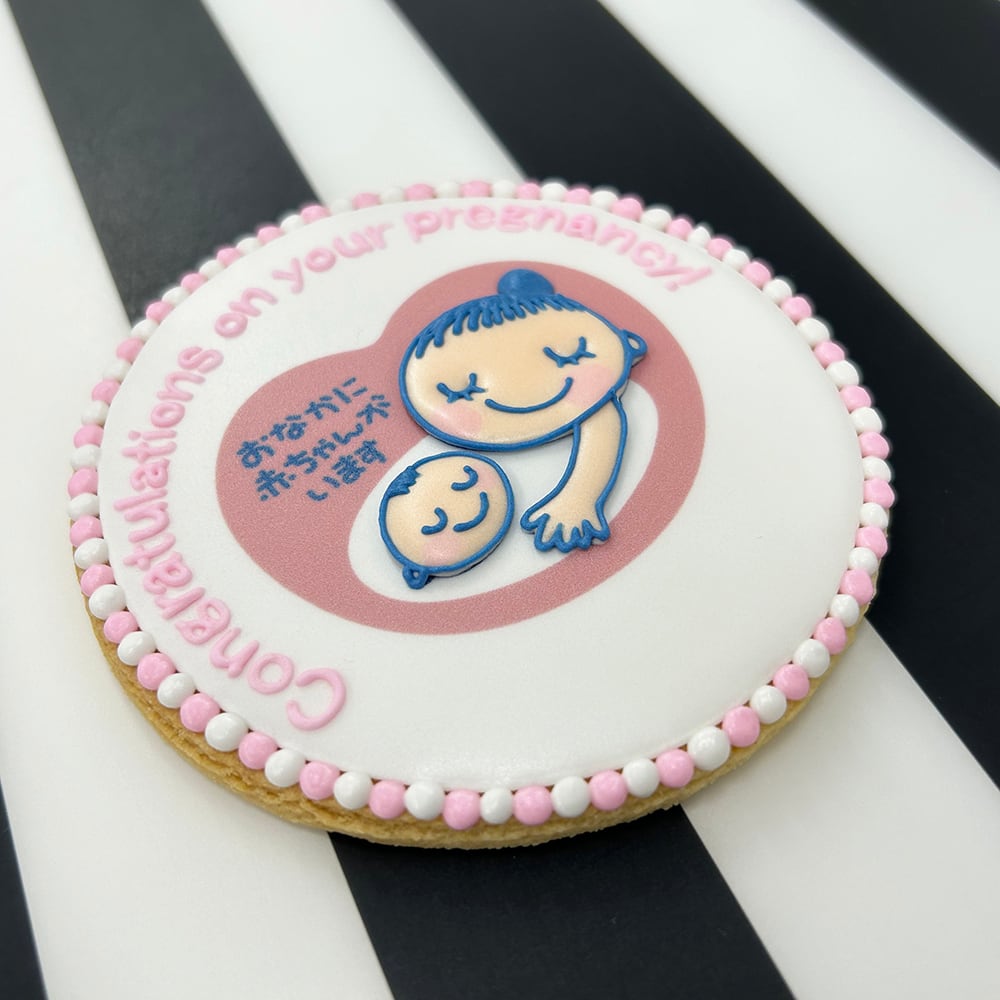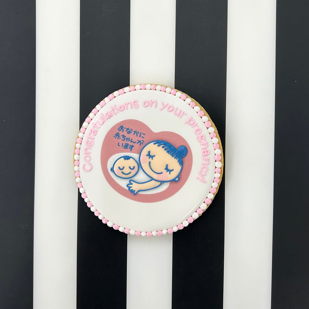 マタニティーマークのアイシングクッキーに、お好きなメッセージをプリントできます。